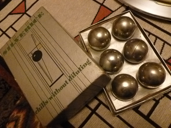 Introduced in 1927, Silverice was initially sold exclusively through Mary Ryan of Fifth Avenue, New York, and cost $6.00 for a box of six. The metal balls contain a liquid. Put them in the freezer and when they are frozen, place in glass. Unlike ice cubes, these won’t dilute your drink. I’m not sure what the liquid is inside Silverice, so I’m a bit leery of using them. But the box has a nice Deco design that I would put out on the bar while having a cocktail party.