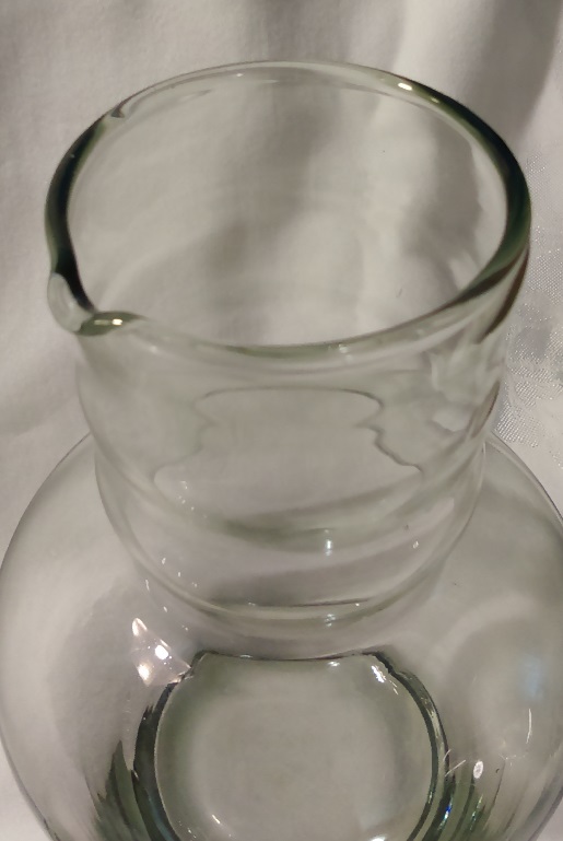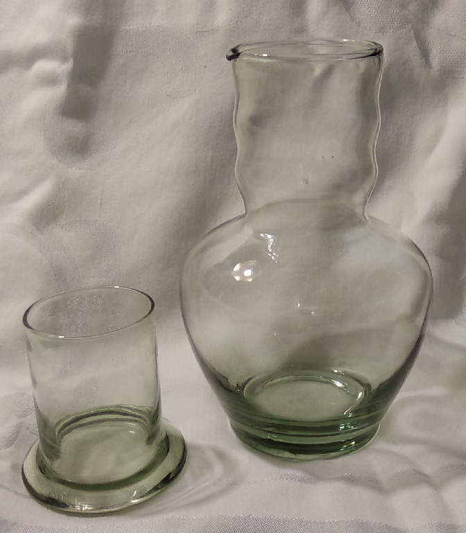 The base of the tumbler (drinking glass) doubles as the lid to keep dust and debris out of your water at night. This Tumble Up is a later design and is considered more difficult to find due to the factory closing. It incorporates innovative design changes such as the tumbler sliding inside the neck of the carafe rather than over the neck as most sets do. By doing this, residual water dripped back into the carafe and not onto your deco furniture. Another tweak is the addition of pouring lip to help prevent drips and spills.