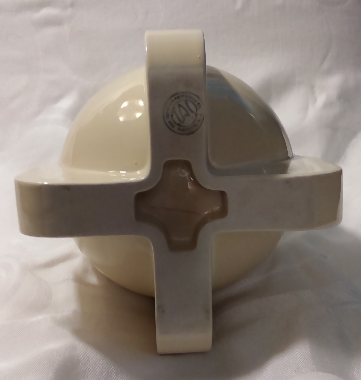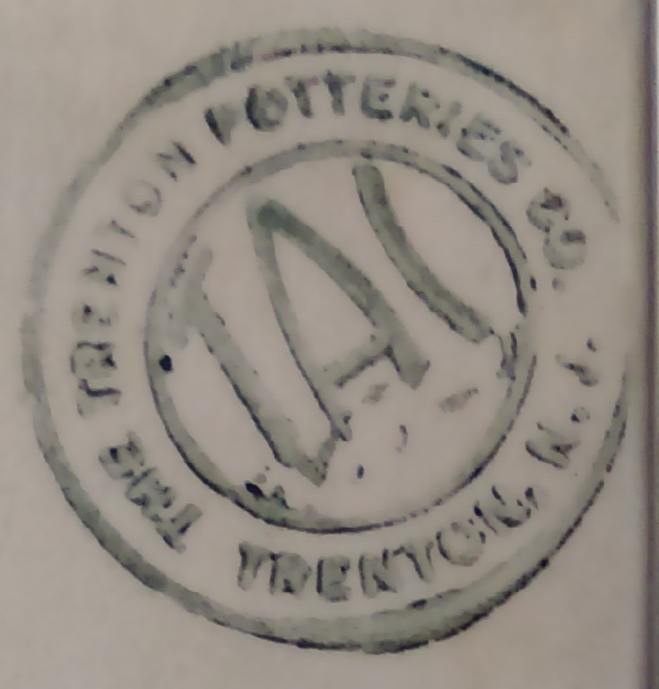 Call it “Ball and Buttress” or “Crossley”, this deco vase came from the Golden Nugget, Lambertville, NJ. It is part of a modernistic line produced in the 1930’s or 1940’s by The Trenton Potteries Co. in Trenton, N.J. This is a large and heavy piece at almost 7″ across. Some sources indicate George Crossley designed the shape as part of the 1930 “Tepeco” line made by MCM and later incorporated in 1935 as part of the Trenton Potteries line. I can’t find much information on the Trenton Potteries Co.